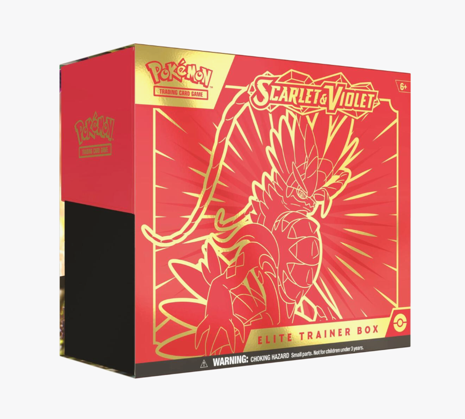 The Pokémon TCG: Scarlet & Violet Elite Trainer Box includes: • 9 Pokémon TCG: Scarlet & Violet booster packs • 1 full-art foil promo card featuring Koraidon • 65 card sleeves featuring Koraidon • 45 Pokémon TCG Energy cards • A player’s guide to the Scarlet & Violet expansion • 6 damage-counter dice • 1 competition-legal coin-flip die • 2 plastic condition markers • A collector’s box to hold everything, with 4 dividers to keep it organized • A code card for Pokémon Trading Card Game Live